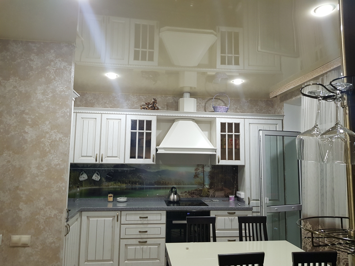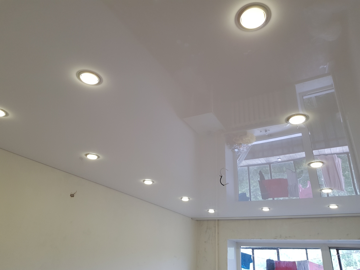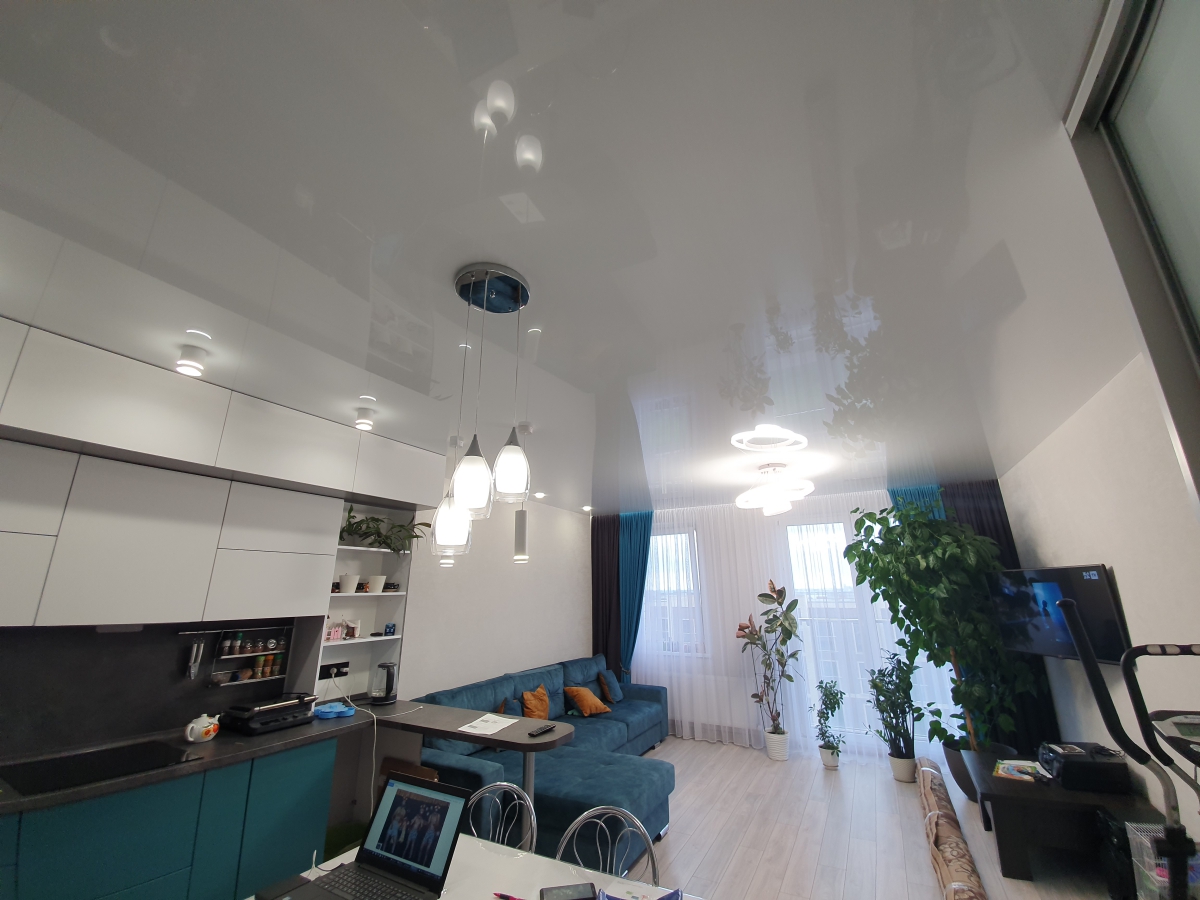 Глянцевые, или, как их иногда называют, «лаковые» полотна – оригинальное решение для Вашего интерьера. Их отражающая поверхность визуально увеличивает пространство, по-этому они идеально подойдут для небольших помещений. Всё же в жилых комплексах этот тип плёнки используют реже. Такие потолки чаще встречаются в барах, ресторанах, кафе, офисах, клубах. Они создают необычный дизайн благодаря своему зеркальному покрытию.